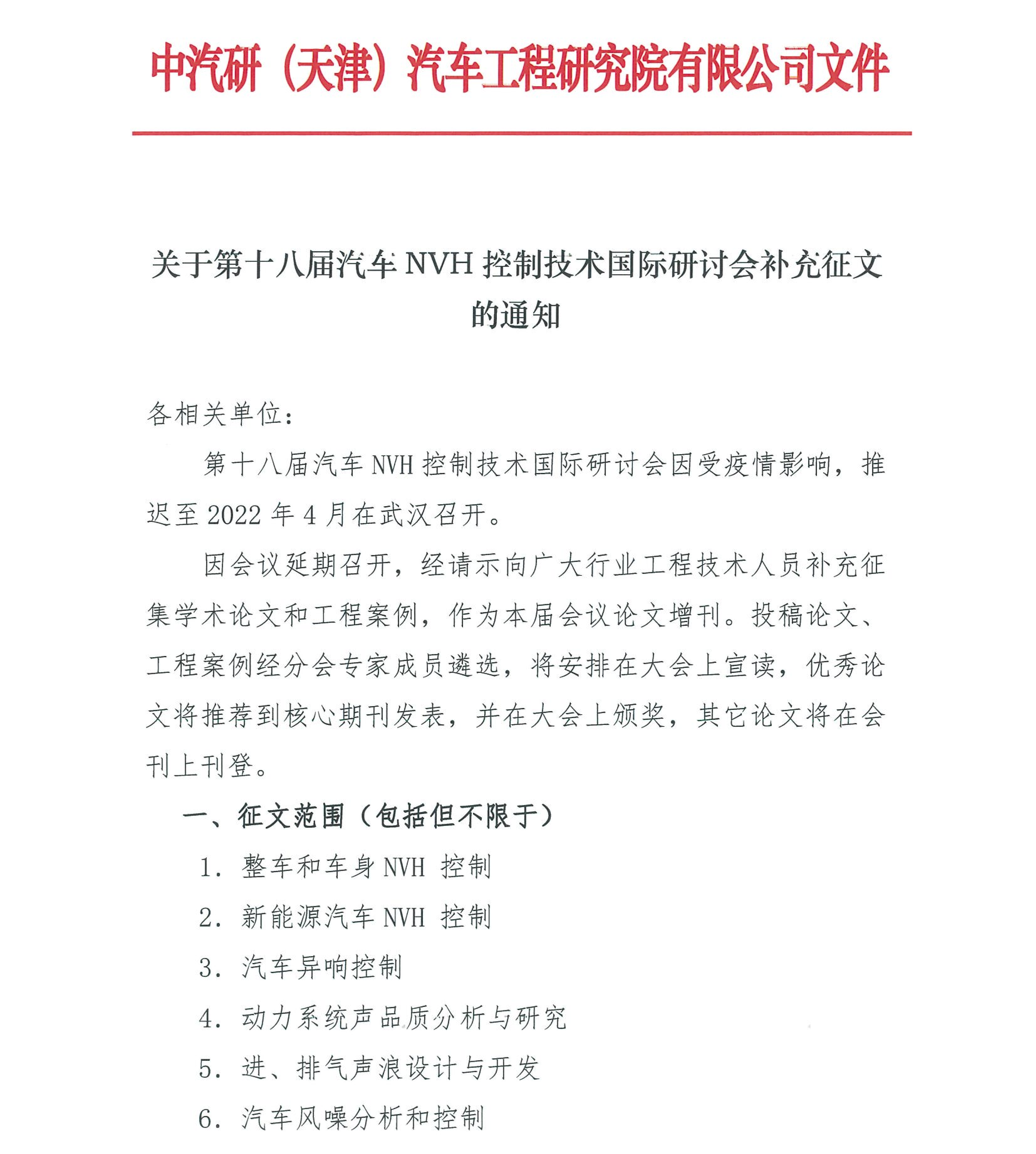 關于第十八屆汽車NVH控制技術國際研討會補充征文的通知
