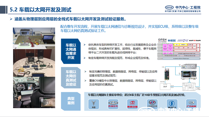 中汽中心工程院電子電氣架構(gòu)與先進總線團隊在車載以太網(wǎng)開發(fā)及測試服務(wù)領(lǐng)域具有強大的技術(shù)實力和豐富的項目經(jīng)驗。團隊依托具體車型的網(wǎng)絡(luò)開發(fā)工作,結(jié)合行業(yè)發(fā)展趨勢及企業(yè)總體規(guī)劃,形成具有可擴展性、延續(xù)性的企業(yè)規(guī)范及標(biāo)準(zhǔn)體系,形成便于二次開發(fā)的車載先進總線網(wǎng)絡(luò)平臺,制定車載以太網(wǎng)網(wǎng)絡(luò)開發(fā)流程及規(guī)范。結(jié)合整車開發(fā)流程,團隊制定完善的車載以太網(wǎng)物理層、數(shù)據(jù)鏈路層、網(wǎng)絡(luò)層、傳輸層以及應(yīng)用層需求規(guī)范及測試規(guī)范,具備覆蓋OSI模型中從物理層、數(shù)據(jù)鏈路層、網(wǎng)絡(luò)層、傳輸層以及應(yīng)用層的仿真測試能力,測試內(nèi)容涵蓋物理層PMA和IOP測試、交換機性能測試、TC8協(xié)議一致性測試、AVB/TSN協(xié)議測試、基于DoIP的診斷協(xié)議測試、BT刷寫測試以及路由測試等全棧式研發(fā)測試鏈。