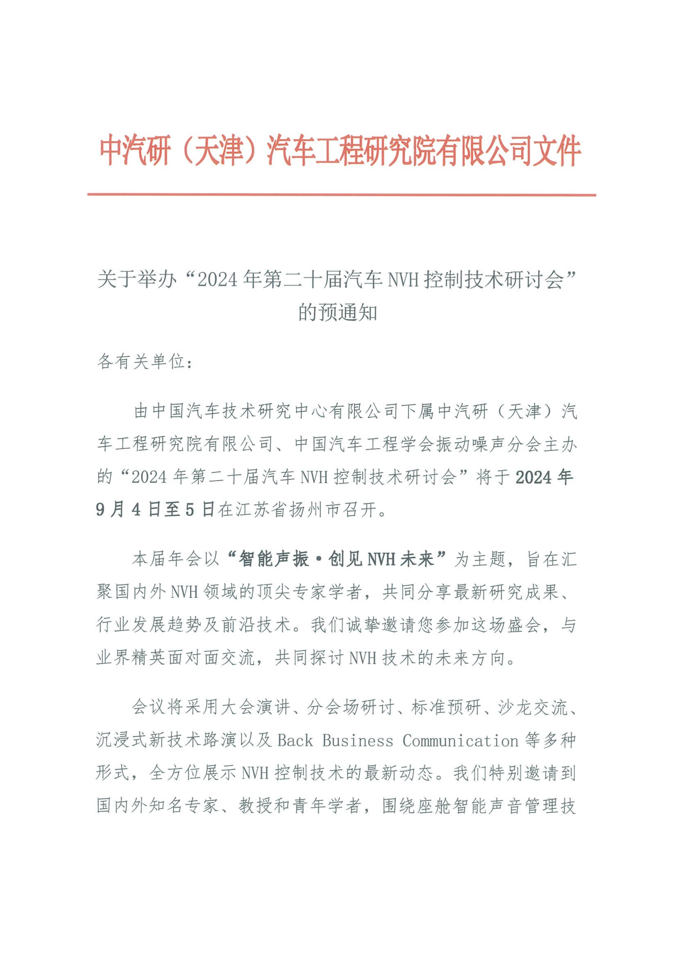 關于舉辦“2024年第二十屆汽車NVH控制技術研討會”的預通知