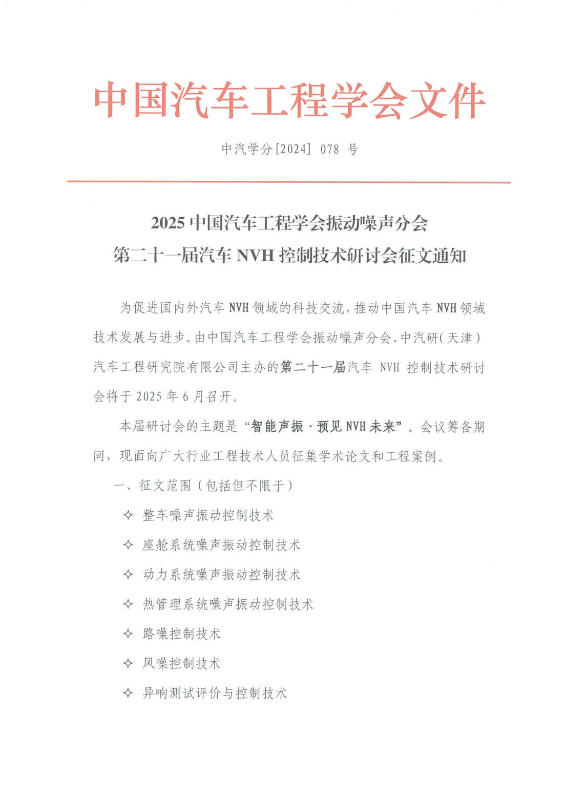 2025中國汽車工程學會振動噪聲分會第二十一屆汽車NVH控制技術研討會征文啟事