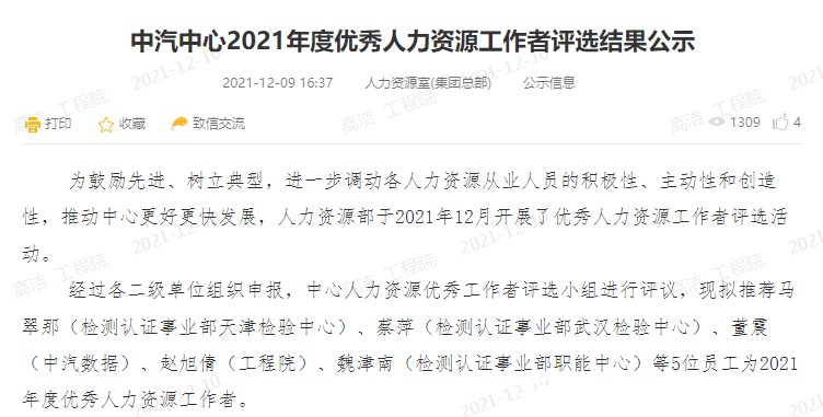 - 趙旭倩同志獲得2021年度中汽中心優(yōu)秀人力資源工作者榮譽(yù)。